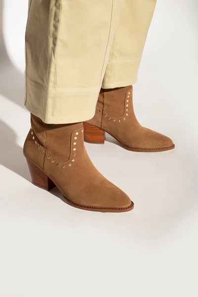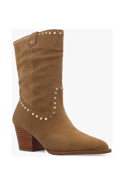 Brown ‘Phoebe’ hulde enkelschoenen van Coach. Gemaakt van suede, dit slip-on paar is verfraaid met goudkleurige studs en heeft een puntige teen en beige rubberen zool.
