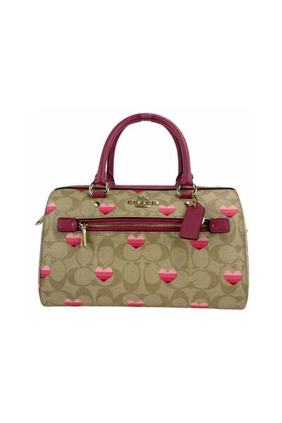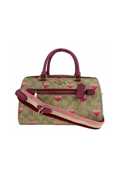 Stijl: Coach (CA248) Stripe Hartafdruk Rowan Medium Satchel Handtas Materiaal: Signature Coated Canvas met gladde lederen trim Kenmerken: Interieur Zip en slipzak, voorste buitenzak, verstelbare/afneembare crossbody -bandmaatregelen: 26,67 cm W x 19,05 cm H x 13,97 cm d