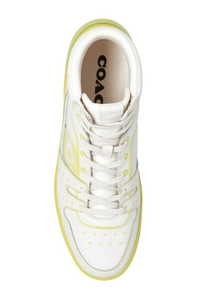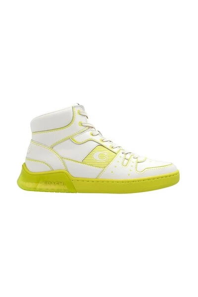 Witte en groene high-top sneakers van Coach. Gemaakt van leer en stof, dit veterpaar heeft een logo-patroon en groene rubberen zool.