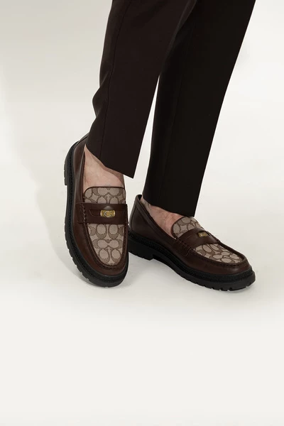 Brown en Cream ‘Sig’ loafers van Coach. Gemaakt van leer, dit model bevindt zich op een zwarte rubberen zool en toont monogram canvas detaillering en een voorriem met logo -hardware.