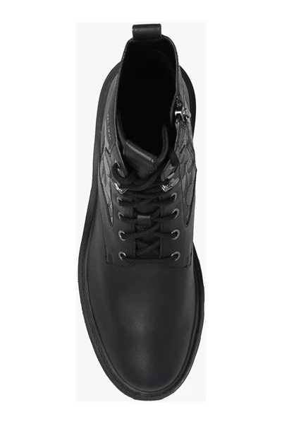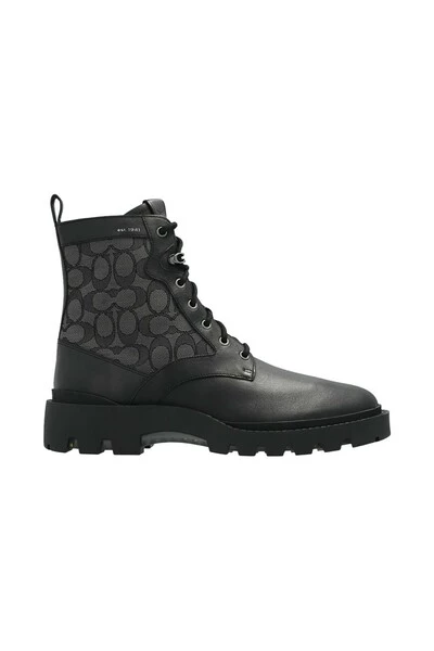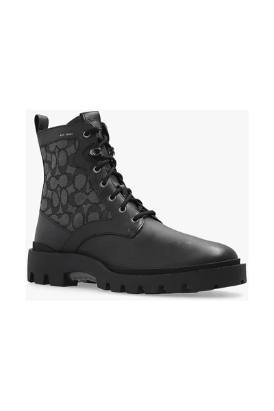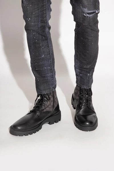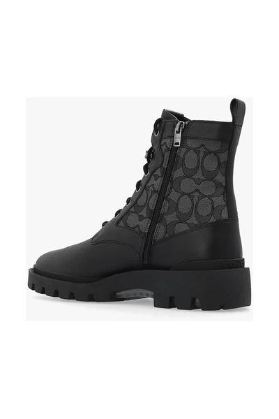 Zwarte en grijze ‘Citysole’ enkelschoenen van Coach. Dit vetermodel is vervaardigd van leer en beschikt over gemonogram canvas detaillering, een zijzip-bevestiging, een logo-geëmbossing tongpleister en een zwarte rubberen zool met een transparante afwerking.