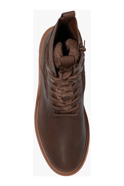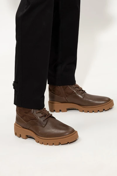 Brown ‘Citysole Lace Up’ enkelschoenen van Coach. Gemaakt van leer en getrimd met shearling, heeft dit model een zijkastje, veterbevestigingen, gewatteerde stofdetails met een monogrampatroon en een bruine rubberen zool met een transparante afwerking.
