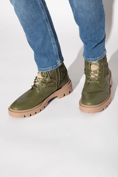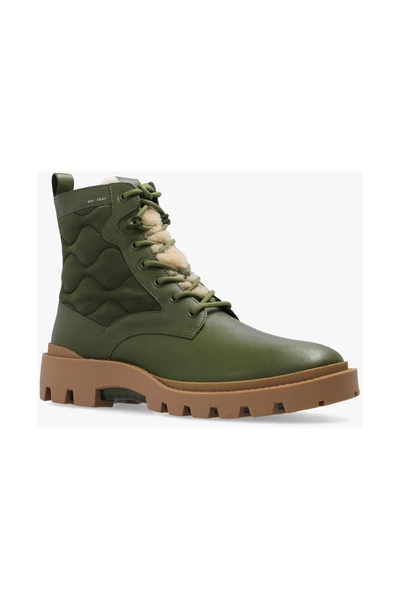 Groene ‘Citysole Lace Up’ enkelschoenen van Coach. Gemaakt van leer en getrimd met crèmekleurige shearling, heeft dit model een zijkastje, veterbevestigingen, gewatteerde stofdetails met een monogrampatroon en een bruine en groene rubberen zool met een transparante afwerking.
