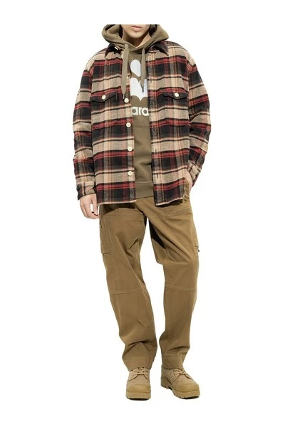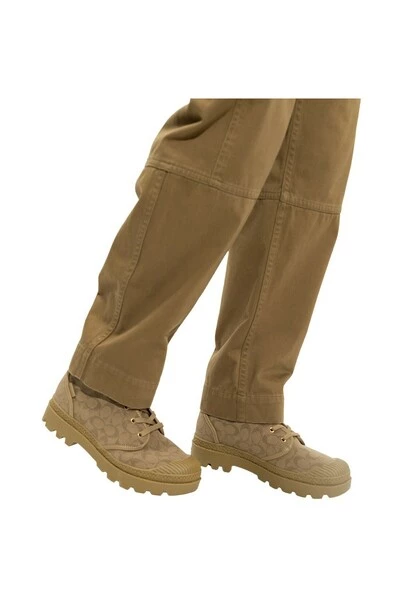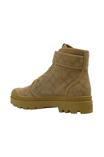 Bruine laarzen van Coach. Dit veterpaar is gemaakt van stof en leer en heeft een riem met een antieke goudkleurige metalen hardware, monogrampatroon en bruine rubberen zool.