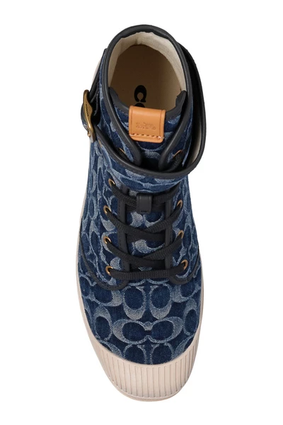 Marineblauw, blauw en beige ‘trooper’ high-top sneakers van coach. Gemaakt van leer en stof, toont dit model het ‘C’ monogrampatroon van het merk, een spitsband van de gesp, een logo-geëmsteerde tongpleister en een beige rubberen zool.