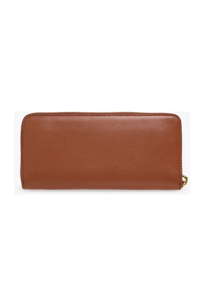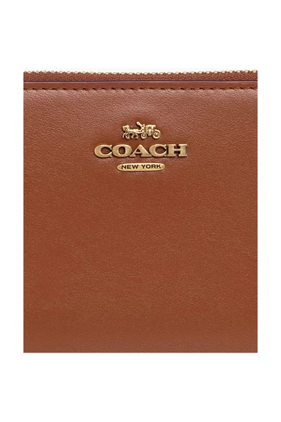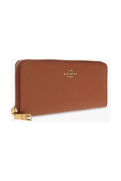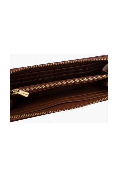 Bruine portemonnee van Coach. Gemaakt van leer, dit ontwerp heeft een ritssluiting, een verouderde goudkleurige metalen logo-plaquette aan de voorkant en twee factuurcompartimenten, een zip-muntenzak, twee slipzakken en acht kaartsleuven erin.