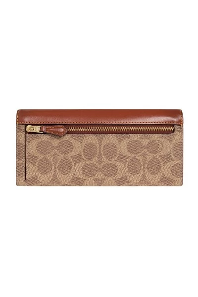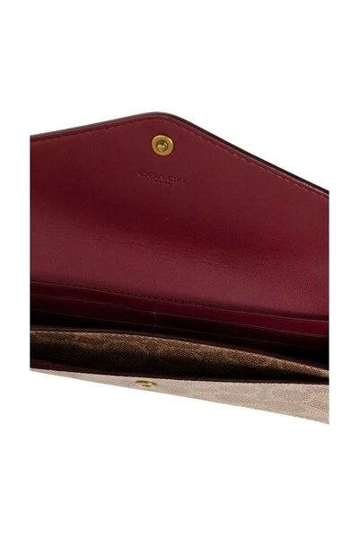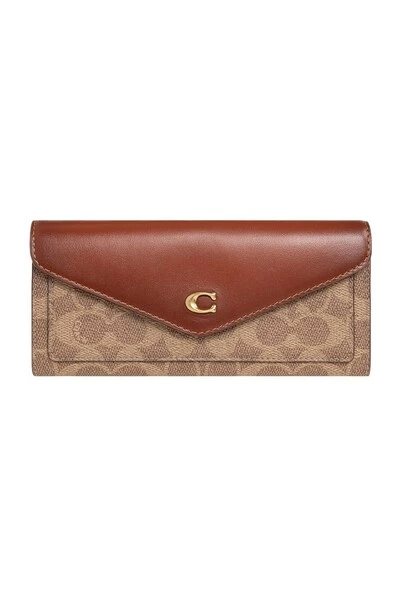 Brown en Beige ‘Wyn’ portemonnee van Coach. Gemaakt van leer en het kenmerkende gecoate canvas van het merk met een monogram, dit item beschikt over een snapssluiting, metalen logo-applicaties, ritssluiting, met metalen hardware met gouden tone en een intern compartiment met twee billzakken en acht kaartsleuven.