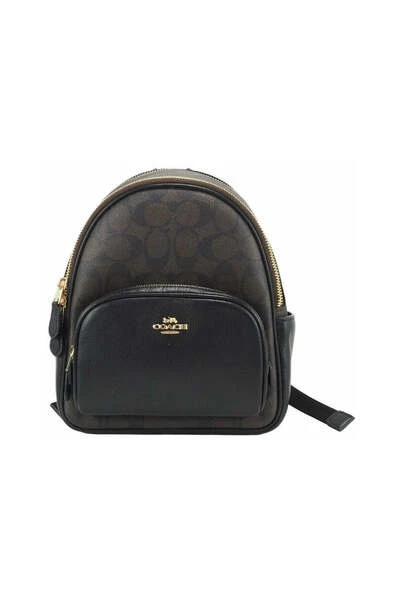 Stijl: Coach Mini Court Backpack Bag (bruin/zwart) Materiaal: kenmerkende gecoate canvas en glad lederen Kenmerken: binnenste rits en slipzak, buitenste ritszak, 2 buitenste zijkantspakken Maten: 20,32 cm w x 22,86 cm h x 8,89 cm d