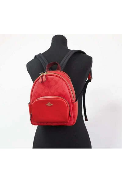 Stijl: Coach Mini Court Backpack Bag (Miami Red) Materiaal: Signature gecoate canvas en glad lederen Kenmerken: binnenste rits en slipzak, buitenste zipzak, 2 buitenste zijkantspakken Maten: 20,32 cm W x 22,86 cm H x 8,89cm Dcoated canvas /Leer