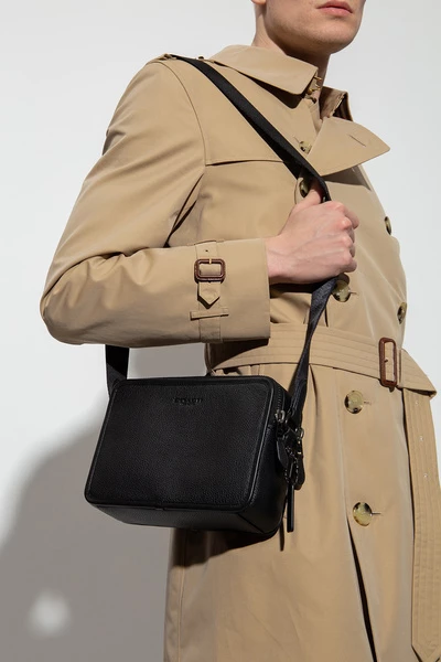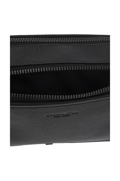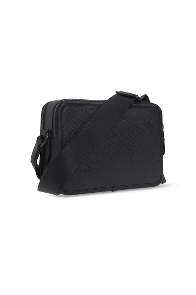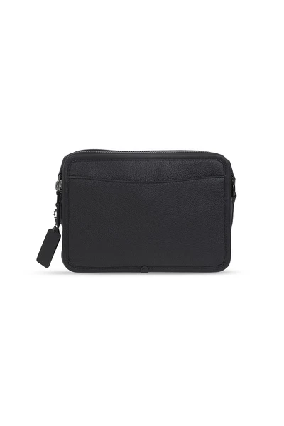 Zwarte schoudertas van coach. Gemaakt van koeienleer, dit ontwerp heeft een logo-plaquette, een achterste slipzak, een verstelbare schouderriem, goudkleurige metalen hardware en een interieur met twee compartimenten, vier slipzakken en een zip-zak.