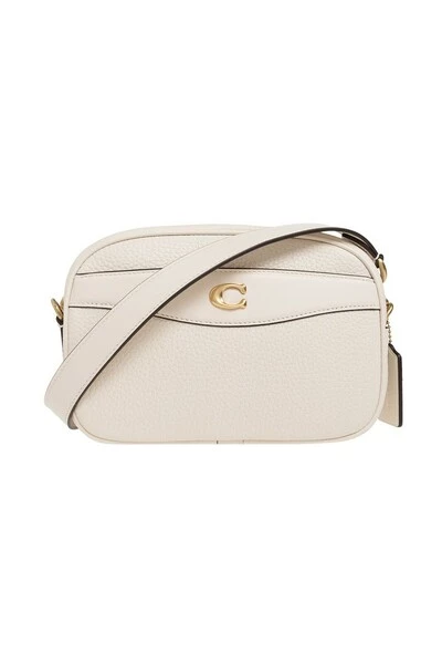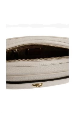 Crème ‘camera’ schoudertas van coach. Dit model is vervaardigd van korrelig leer en beschikt over een ritssluiting, voorzak met een metalen logo-applicatie, afneembare en verstelbare schouderriem, merkborstels, goudkleurige metalen hardware en een intern compartiment met één zipzak.