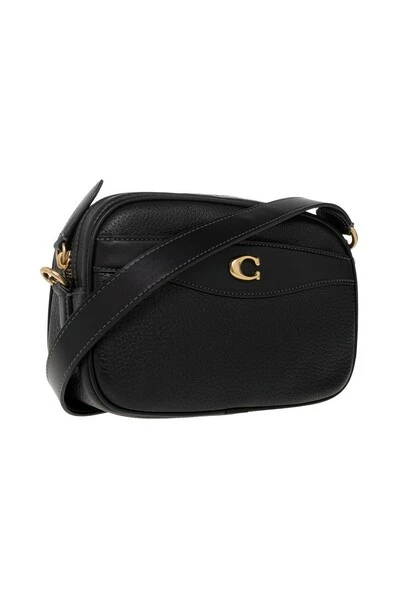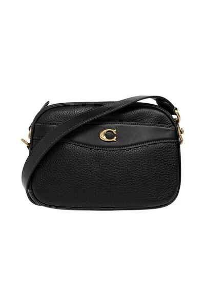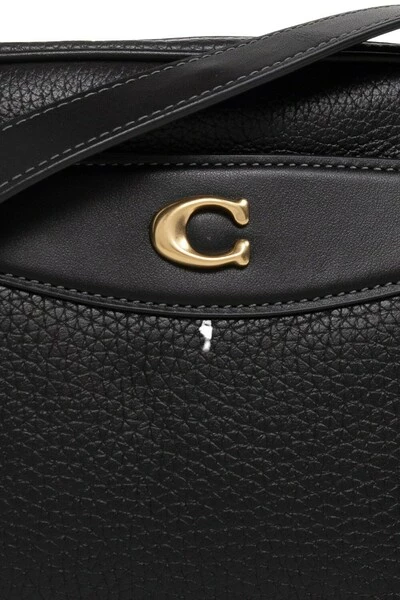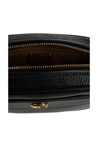 Zwarte ‘camera’ schoudertas van coach. Dit model is vervaardigd van korrelig leer en beschikt over een ritssluiting, voorzak met een metalen logo-applicatie, afneembare en verstelbare schouderriem, merkborstels, goudkleurige metalen hardware en een intern compartiment met één zipzak.