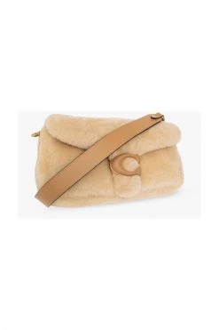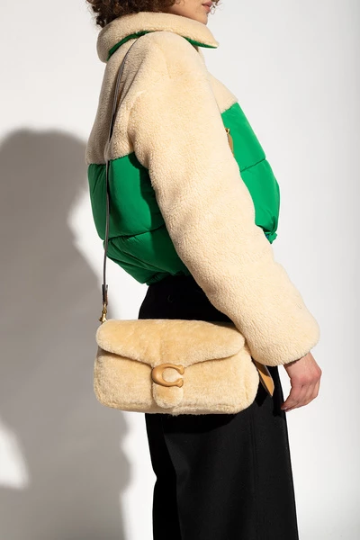 Licht beige ‘Pillow Tabby 26’ schoudertas van coach. Dit ontwerp is gemaakt van schapenbont en leer en heeft een snapsflitsing met een logo-applicatie, een bevestigde sleutelhanger, een afneembare bontgreep, een verstelbare lederen schouderriem, metalen metalen hardware met goud en een ritssluiting binnen.