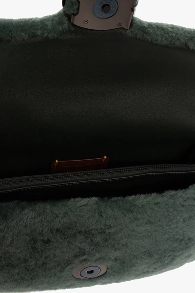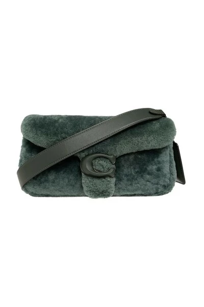 Donkergroene ‘Pillow Tabby 26’ schoudertas van coach. Dit ontwerp is gemaakt van schapenbont en leer en heeft een snapsflitsing met een logo-applicatie, een bevestigde sleutelhanger, een afneembare bontgreep, een verstelbare lederen schouderriem, metalen metalen hardware met goud en een ritssluiting binnen.