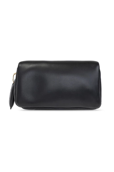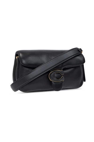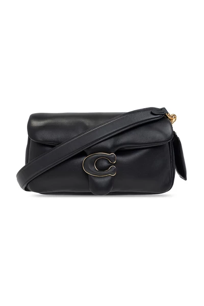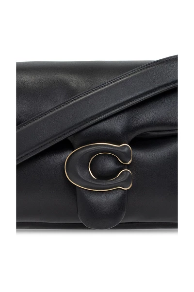 Zwarte `kussen tabby` schoudertas van coach. Gemaakt van glad leer, dit ontwerp beveiligt met een snap en toont een decoratief logo-embleem, een afneembare halfronde handgreep en schouderriem, goudkleurige metalen hardware, een aangesloten charme met een reliëfslogo en een interieur met twee compartimenten en een rits zak.