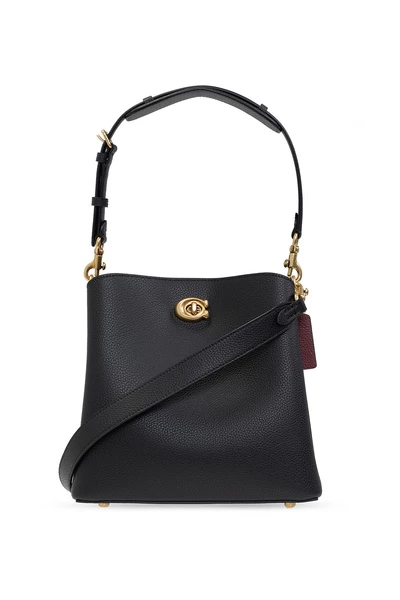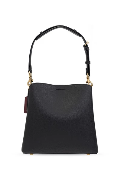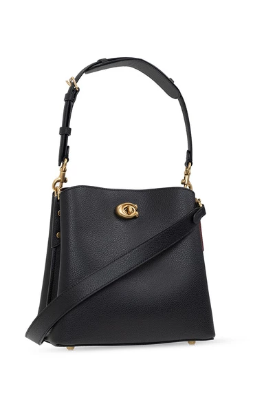 Zwarte schoudertas van coach. Gemaakt van leer, dit ontwerp beveiligt zich met een magnetische bevestigingsmiddel en toont een logo-applicatie, een verstelbare schouderriem, goudkleurige metalen hardware en een interieur met twee compartimenten en een zipzak.