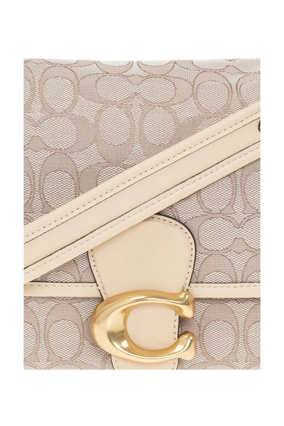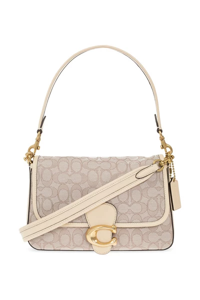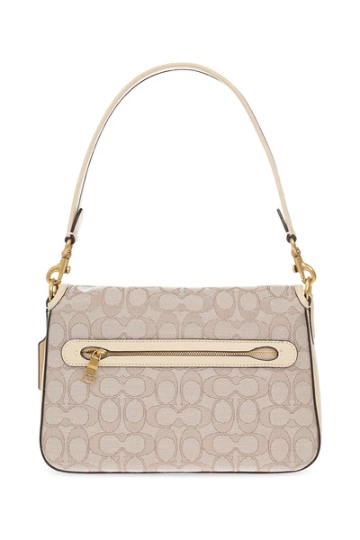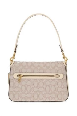 Cream en Brown ‘Sig Jaq Soft’ schoudertas van coach. Gemaakt van monogram canvas, dit ontwerp beveiligt met een snap en heeft lederen versieringen, een metalen logo-plaque aan de voorkant, een achterste zak, een halve ronde handgreep, een afneembare en verstelbare schouderband, goudkleurige metalen hardware en een interne Compartiment met een zipzak.