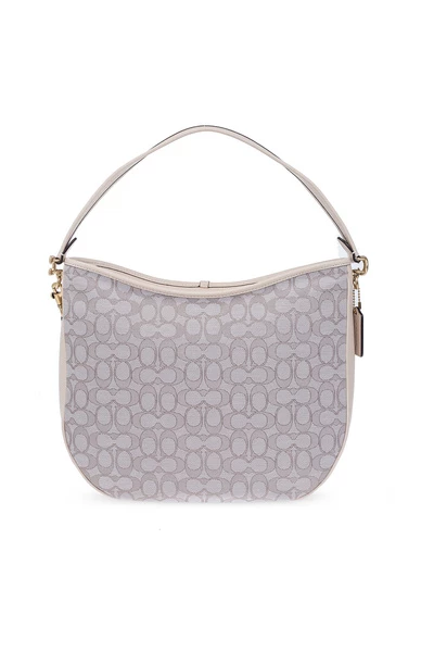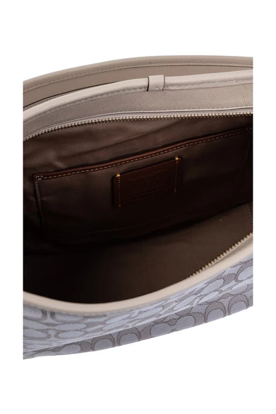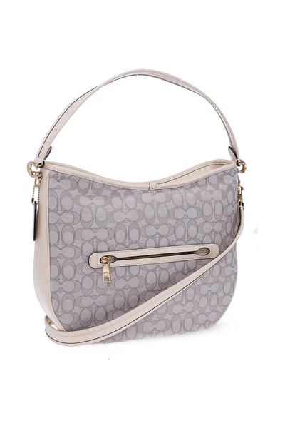 Licht beige ‘Soft Tabby’ schoudertas van coach. Gemaakt van monogram canvas, dit ontwerp beveiligt met een ritssluiting en beschikt over lederen versieringen, een rugzak van de achterste, een hendel met een halfronde, een afneembare en verstelbare schouderband, goudkleurige metalen hardware en een intern compartiment met een slipzak.