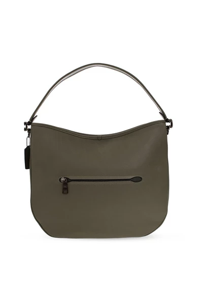 Groene ‘Soft Tabby’ schoudertas van coach. Gemaakt van leer, dit ontwerp beveiligt zich met een rits en beschikt over een achterste zak, logo-appliqués aan de zijkanten, een korte, halfronde band, een afneembare en verstelbare riem, grijze metalen hardware en een intern compartiment met een slipzak.