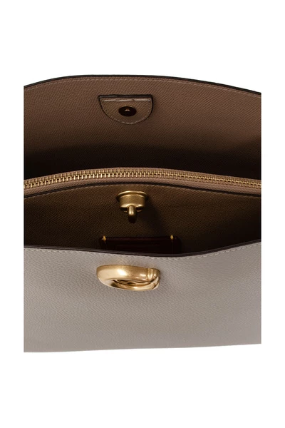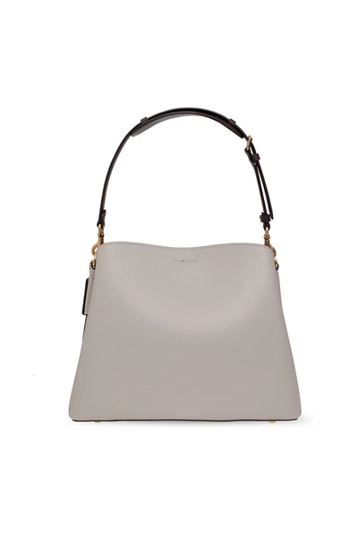 Grijze en bruine ‘Willow’ schoudertas van coach. Gemaakt van leer, dit ontwerp beschikt over drie afzonderlijke compartimenten-één heeft een magnetische sluiting, de tweede heeft een ritssluiting, de derde heeft een onderscheidende logo-vormige bevestiging. Het is compleet met twee afneembare en verstelbare schouderbanden (één is langer), goudkleurige metalen hardware en een op beige geklede interieur.