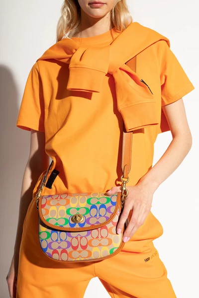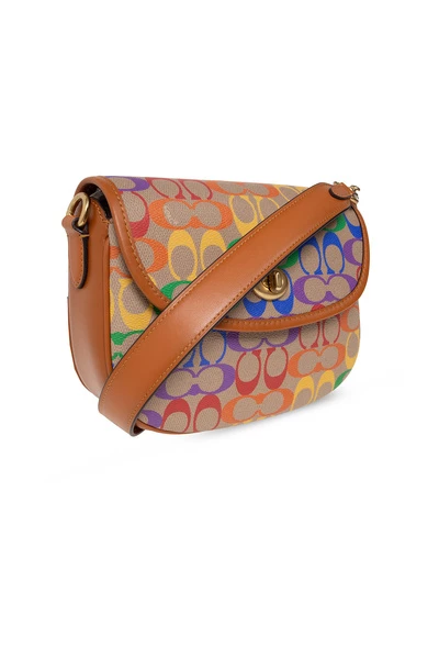 Gemeenschappelijke ‘wilg’ schoudertas van coach. Versierd met een monogrampatroon, beveiligt dit ontwerp vast met een snap en heeft een achterste slipzak, een schouderriem, goudkleurige metalen hardware en een intern compartiment met één slipzak en een zipzak.