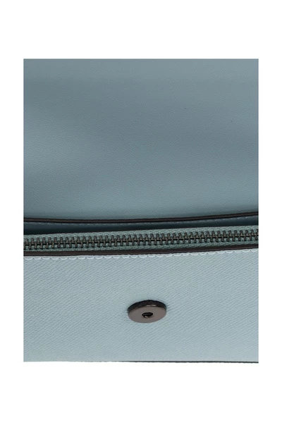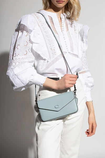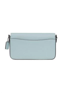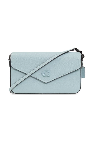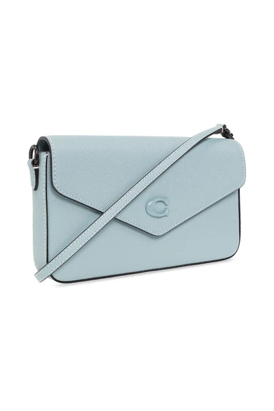 Lichtblauwe ‘Wyn’ schoudertas van coach. Gemaakt van korrelig leer, dit ontwerp beveiligt zich met een persstudie en toont een logo-applicatie op de klep, een achterste slipzak, een verstelbare en afneembare schouderriem, donkere zilveren metalen hardware en een intern compartiment met een slipzak. Het wordt geleverd met een zip -zakje uitgerust met zes kaartslots.