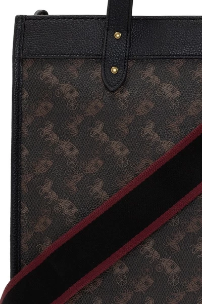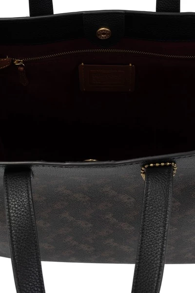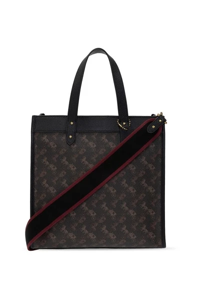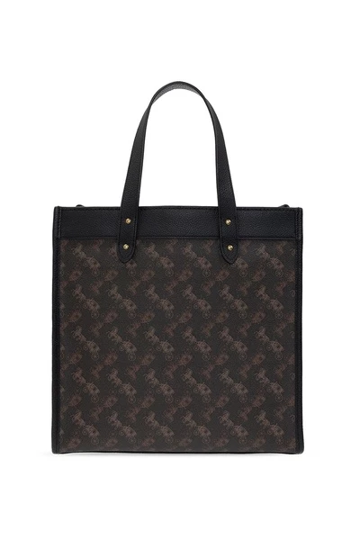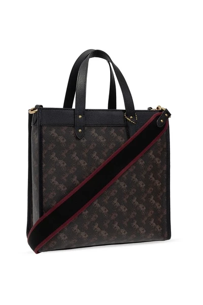Black and Brown `Field` Shopper Bag van Coach. Gemaakt van leer en canvas die de iconische print van het merk aantrekken, bevestigt dit ontwerp via snap-knop en gebruikt twee halfronde handgrepen, blootgestelde stikingsdetails, een afneembare en verstelbare schouderriem, goudkleurige metalen hardware en kastanjebruine interieur met één compartment en Eén zip -zak.