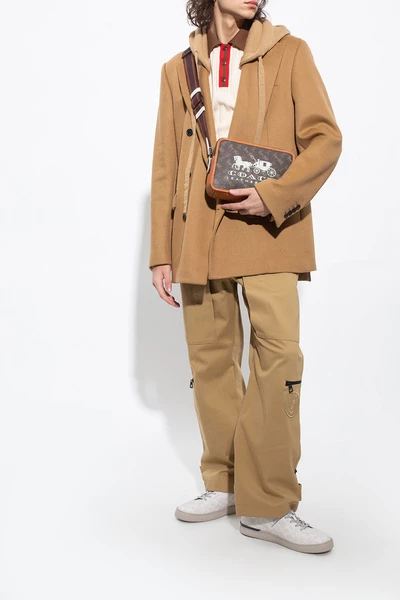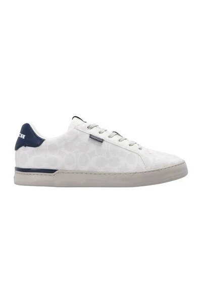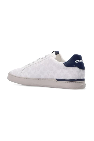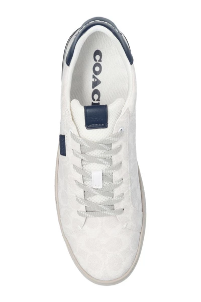 Witte en lichtgrijze sneakers van coach. Gedecoreerd met een monogrampatroon, heeft dit veter-uppaar een marinehieltabblad met een verhoogd logo in wit en een rubberen zool in grijs en marine.