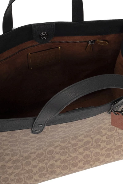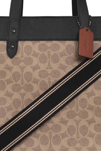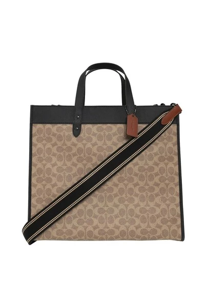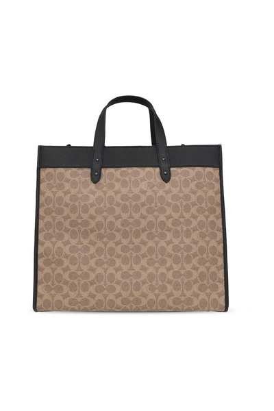 Brown, Beige en Black ‘Field 40’ shoppertas van Coach. Gemaakt van leer en canvas versierd met het `C` Monogram van het merk, dit ontwerp heeft een magnetische bevestigingsmiddel, twee halve ronde handgrepen, een afneembare en verstelbare schouderriem, metalen metalen hardware met donkere zilvertonen en een suède ingeklede interieur met één compartiment en Eén zak met een tweerichtingszip.